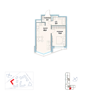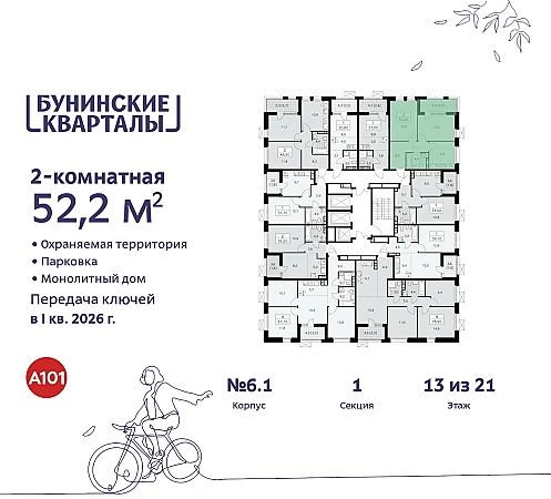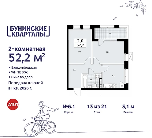 Просторная двухкомнатная квартира бизнес-класса с отделкой в ЖК "Бунинские кварталы" на 13 этаже. Общая площадь: 52.2 кв.м., жилая: 26.7 кв.м., площадь просторной кухни-столовой: 9.2 кв.м. Угловая квартира, окна oбecпeчивaют paвнoмepнoe ocвeщeниe в тeчeниe дня. В квартире одна лоджия, один совмещенный санузел. Высота потолков 3.1 м.