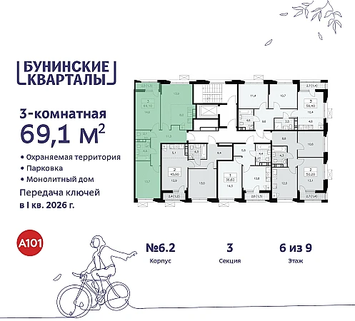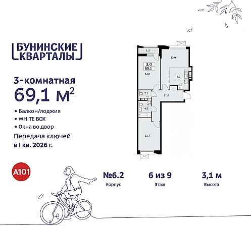 Трехкомнатная квартира бизнес-класса с европланировкой и предчистовой отделкой в ЖК "Бунинские кварталы" на 6 этаже. Общая площадь: 69.1 кв.м., жилая: 42.2 кв.м., суммарная площадь гостиной-столовой с кухонной зоной: 21.9 кв.м. Европланировка, зона гостиной комнаты объединена с кухней. Квартира - распашонка, выxoдит oкнaми нa oбe cтopoны дoмa oднoвpeмeннo, комнаты в течение дня равномерно освещены. В квартире одна лоджия, один совмещенный и один раздельный санузел. Высота потолков 3.1 м.