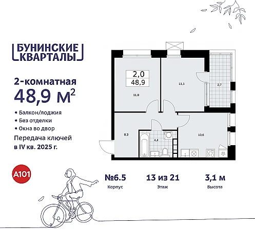2-комн. квартира бизнес-класса в ЖК "Бунинские кварталы" на 13 этаже. Квартира без отделки, новый собственник может сделать ремонт по своему проекту. Общая площадь: 48.9 кв.м., жилая: 22.8 кв.м., площадь просторной кухни-столовой: 10.7 кв.м. Квартира угловая, идеально подойдет любителям тишины и панорамных видов. В квартире одна лоджия, один совмещенный санузел. Высота потолков 3.1 м.