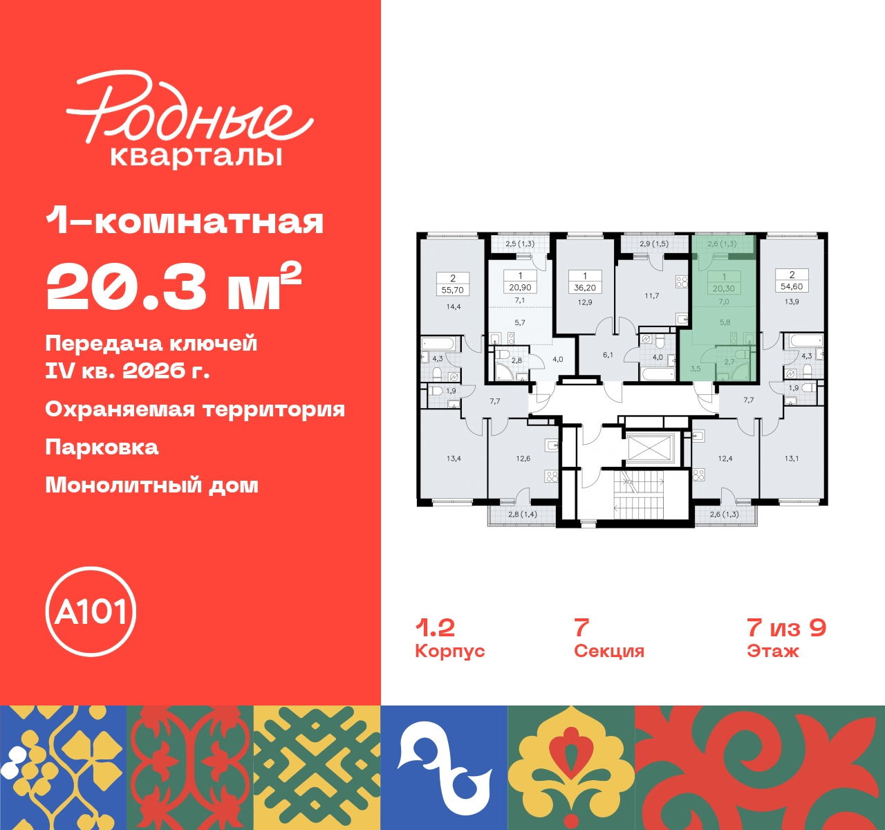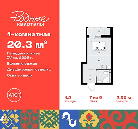 1-комн. квартира-студия с отделкой в ЖК "Родные кварталы" на 7 этаже. Общая площадь: 20.3 кв.м., площадь гостиной 12.8 кв.м., из которых 5.8 кв.м. выделено под кухонную зону. Все окна выходят на одну сторону. В квартире один балкон, один совмещенный санузел. Высота потолков 2.9 м.