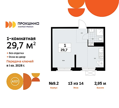 Однокомнатная квартира-студия в ЖК "Прокшино" на 13 этаже. Квартира без отделки, новый владелец может сделать ремонт по индивидуальному дизайн-проекту. Общая площадь: 29.7 кв.м., площадь гостиной 23.6 кв.м., из которых 5.2 кв.м. выделено под кухонную зону. Все окна выходят на одну сторону. В квартире один совмещенный санузел. Высота потолков 2.95 м.