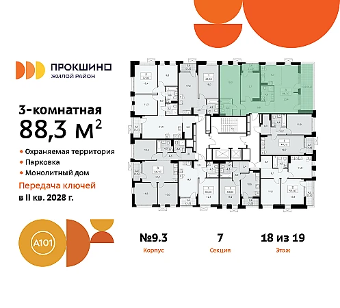 Квартира находится в корпусе 9.3. Дом монолитный, одноподъездный, высотой 19 этажей. На этаже 9 квартир. В подъезде 1 пассажирский и 1 грузовой лифт. Начало строительства - 3 квартал 2025 года. Окончание строительства - 4 квартал 2027 года. Оформление сделки по договору долевого участия.