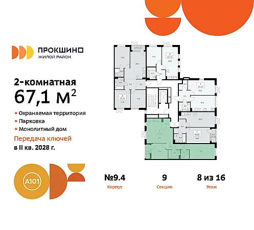 Дом монолитный, черырехподъездный, переменной этажности, от 10 до 16 этажей. Квартира находится во 2-й секции высотой 10 этажей в корпусе 9.4. На этаже 6 квартир. В подъезде 1 грузовой лифт. Начало строительства - 3 квартал 2025 года. Окончание строительства - 4 квартал 2027 года. Оформление сделки по договору долевого участия.