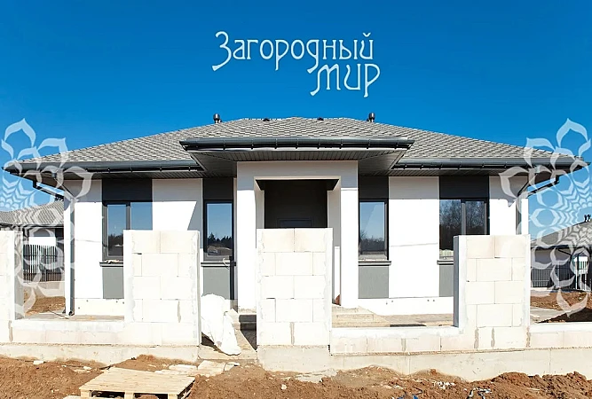 Построенный из газобетонных блоков D400 на монолитной плите, внешне дом отделан штукатуркой "Короед" и покрашен фасадной краской. Кровля - мягкая черепица, окна - стеклопакеты. В доме