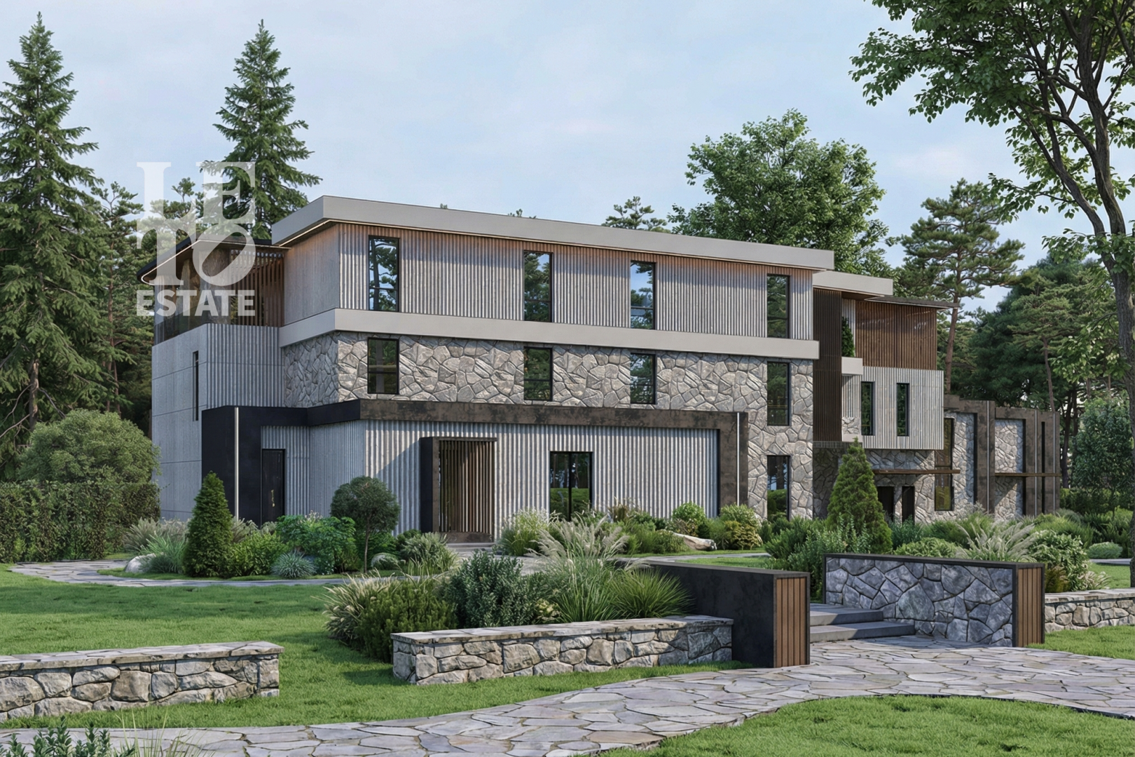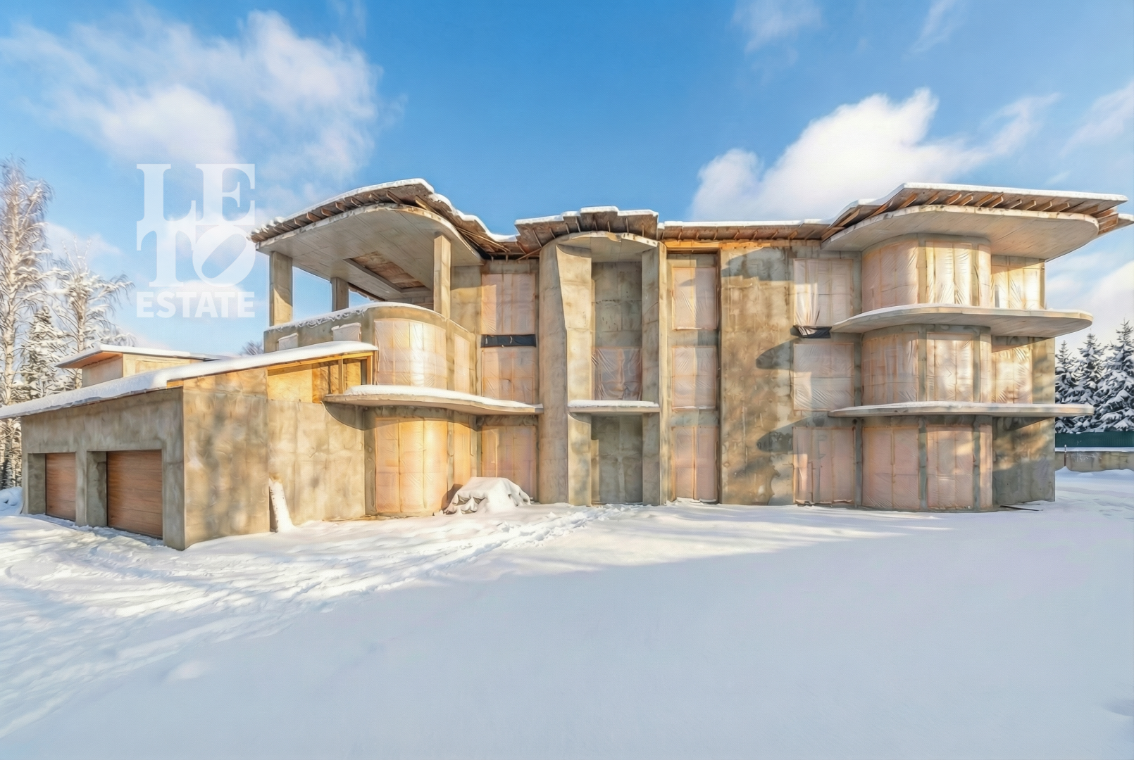 На участке располагается комплекс из трех строений. Это основной дом (700 кв.м), бассейный комплекс (620 кв.м) и домик для барбекю (62 кв.м). Светлый современный дом для большой семьи, отличающийся продуманной планировкой и функциональностью. Основной дом соединен с бассейным комплексом теплым переходом. Во внутренней отделке преобладают светлые тона.