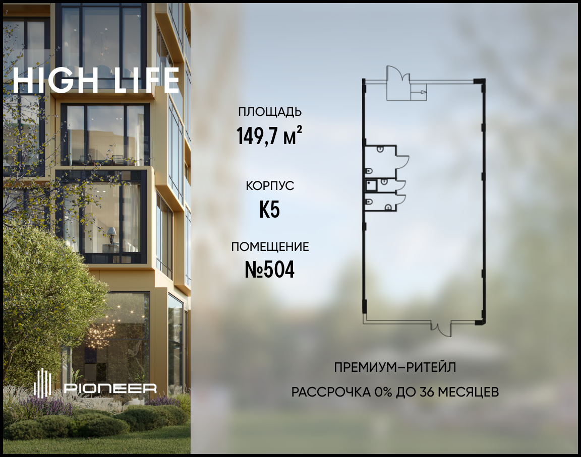 Помещение площадью 149,7 кв. м. в комплексе небоскребов HIGH LIFE. В шаговой доступности от м. Павелецкая и Садового кольца. Отдельный вход. Витринное остекление 4,5 м.