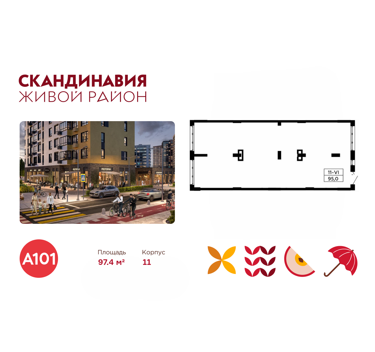 Всё это обеспечивает высокий пешеходный трафик и востребованность коммерческих объектов. Любой объект инфраструктуры «Скандинавии» находится в шаговой доступности. Многие жители не покидают локацию в течение дня, пользуясь услугами и делая покупки.