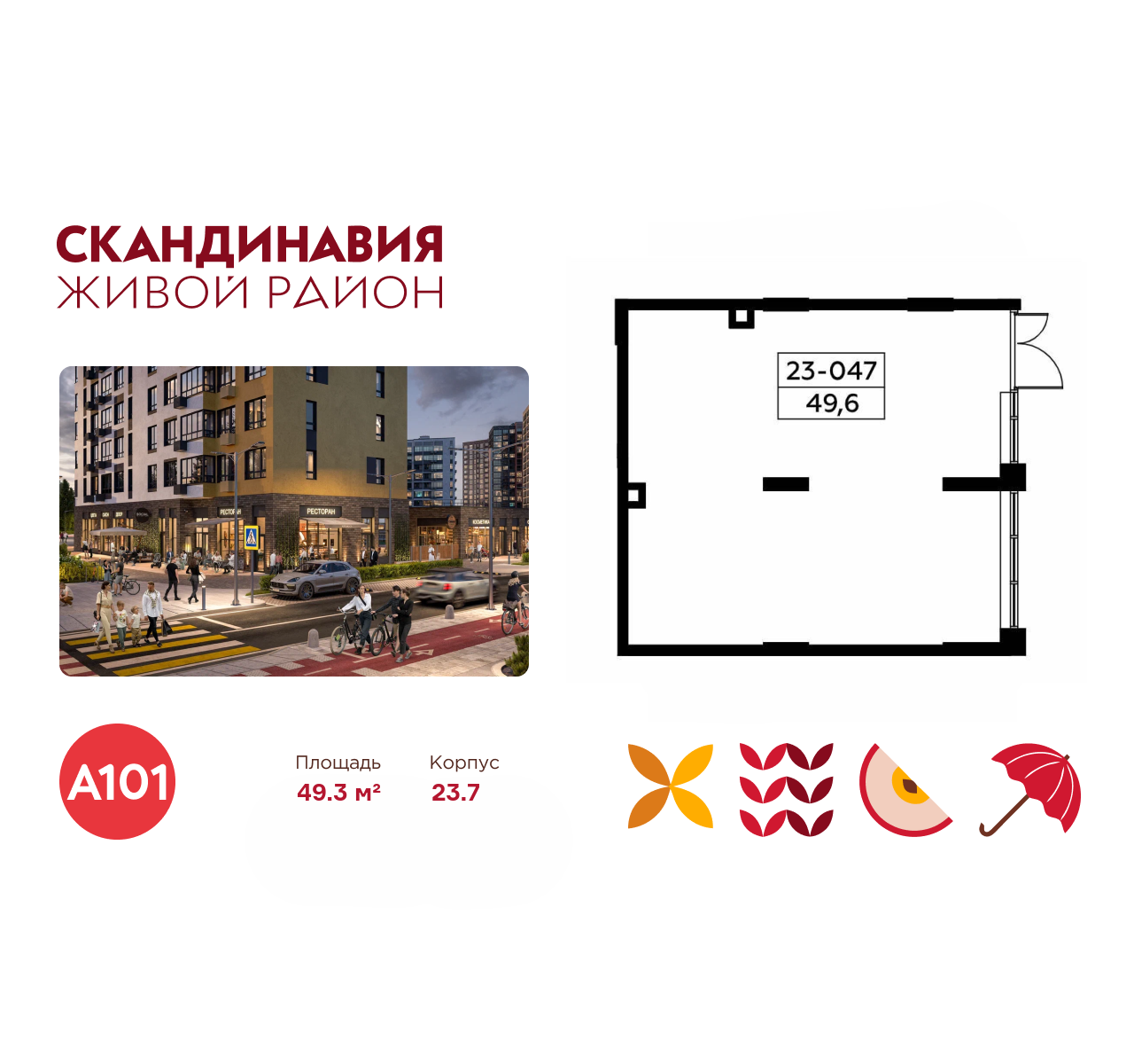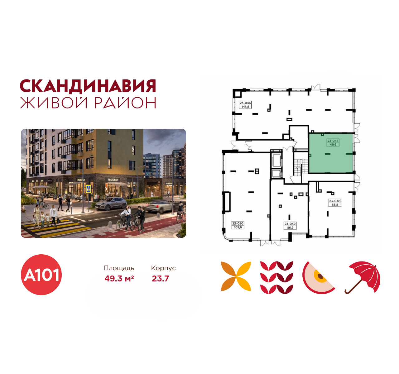 Всё это обеспечивает высокий пешеходный трафик и востребованность коммерческих объектов. Любой объект инфраструктуры «Скандинавии» находится в шаговой доступности. Многие жители не покидают локацию в течение дня, пользуясь услугами и делая покупки.