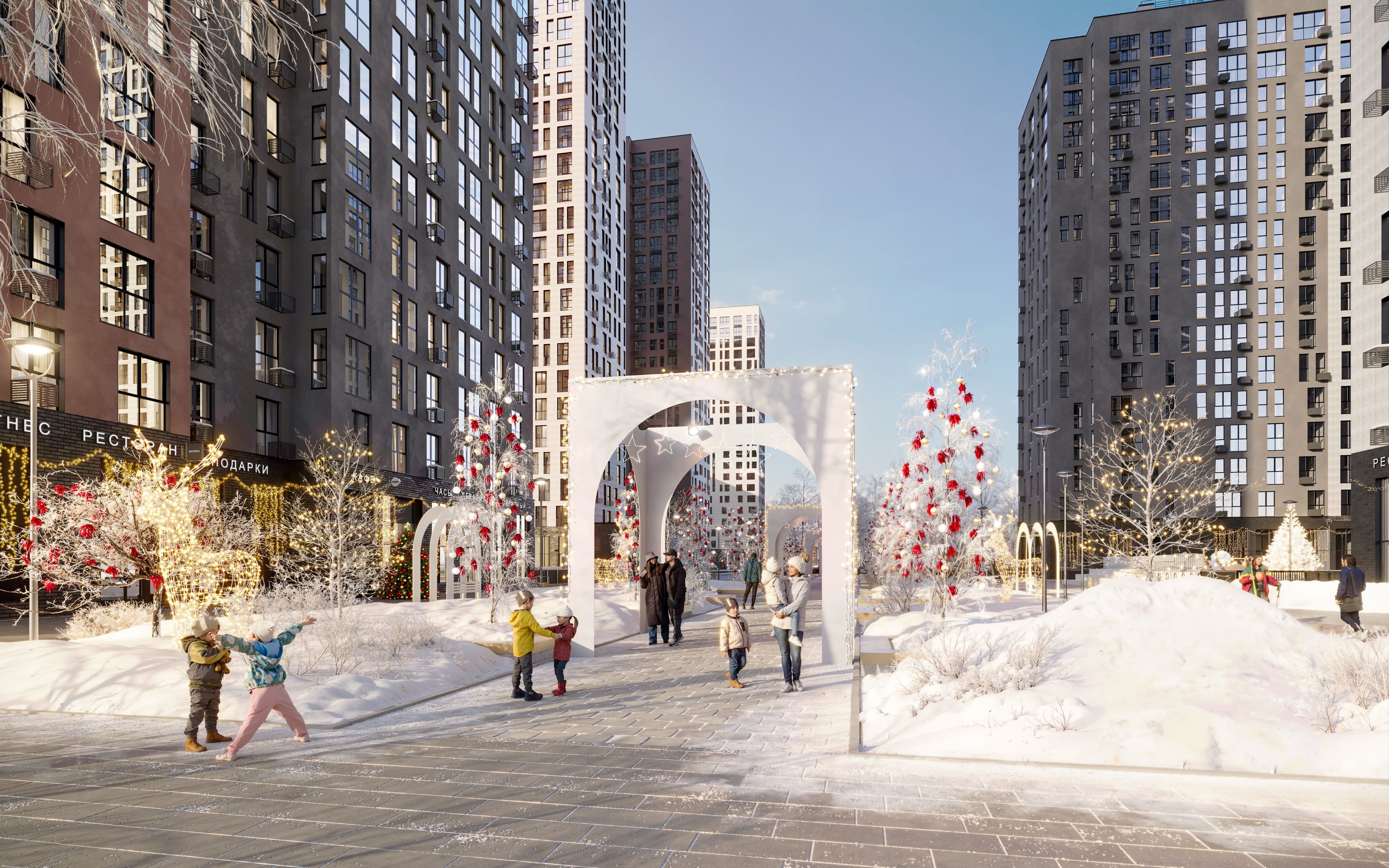 Благоустройство жилого комплекса включает создание парка внутри района, двора-патио, амфитеатра, мест отдыха и прогулочных пространств, формирующих активный пешеходный трафик. Особое внимание уделено благоустройству коммерческих зон с целью привлечения к ним дополнительного внимания: архитектурные элементы, перголы, скамейки, парклет.
