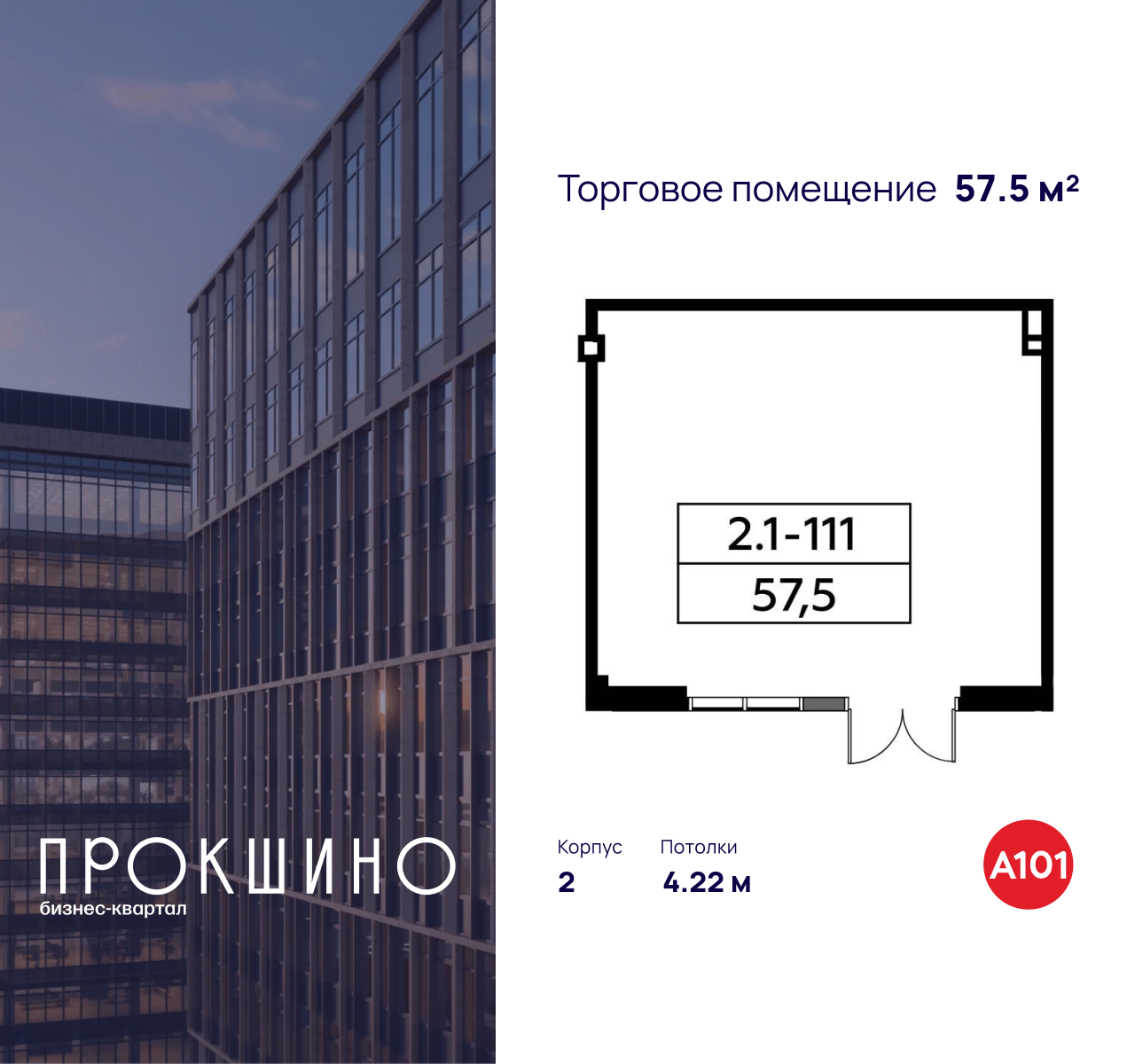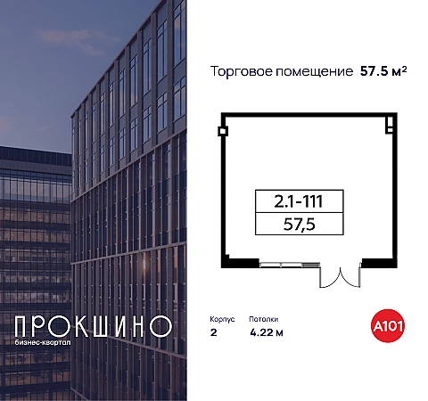Продаётся торговое помещение площадью 57.5 кв. м. в Бизнес-квартал «Прокшино». Без отделки. Окна с видом на улицу. Высота потолков 4.22 м. Выделенная электрическая мощность — 15 кВт. Отдельный вход с улицы. Стоимость помещения — 37 621 100 руб. Способы оплаты и более подробная информация по телефону.