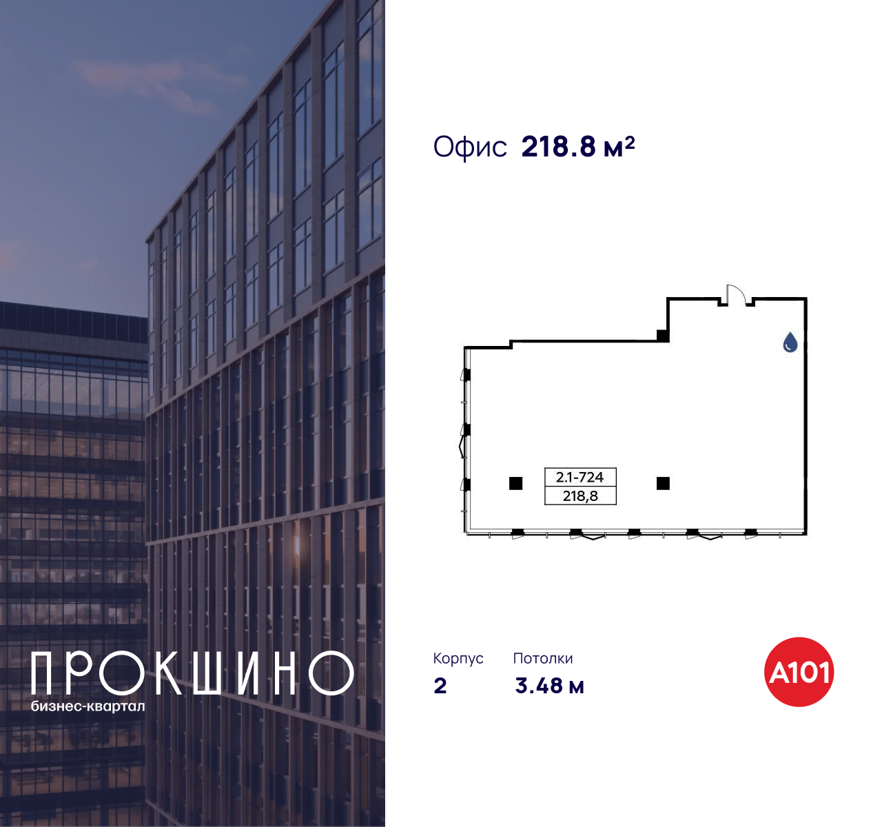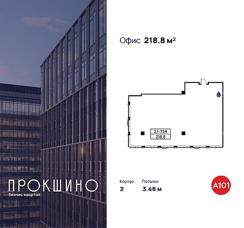 Продаётся офисное помещение площадью 218.8 кв. м. в Бизнес-квартал «Прокшино». Без отделки. Окна с видом на улицу. Высота потолков 3.48 м. Выделенная электрическая мощность — 20 кВт. Отдельный вход с улицы. Стоимость помещения — 61 355 896 руб. Способы оплаты и более подробная информация по телефону.