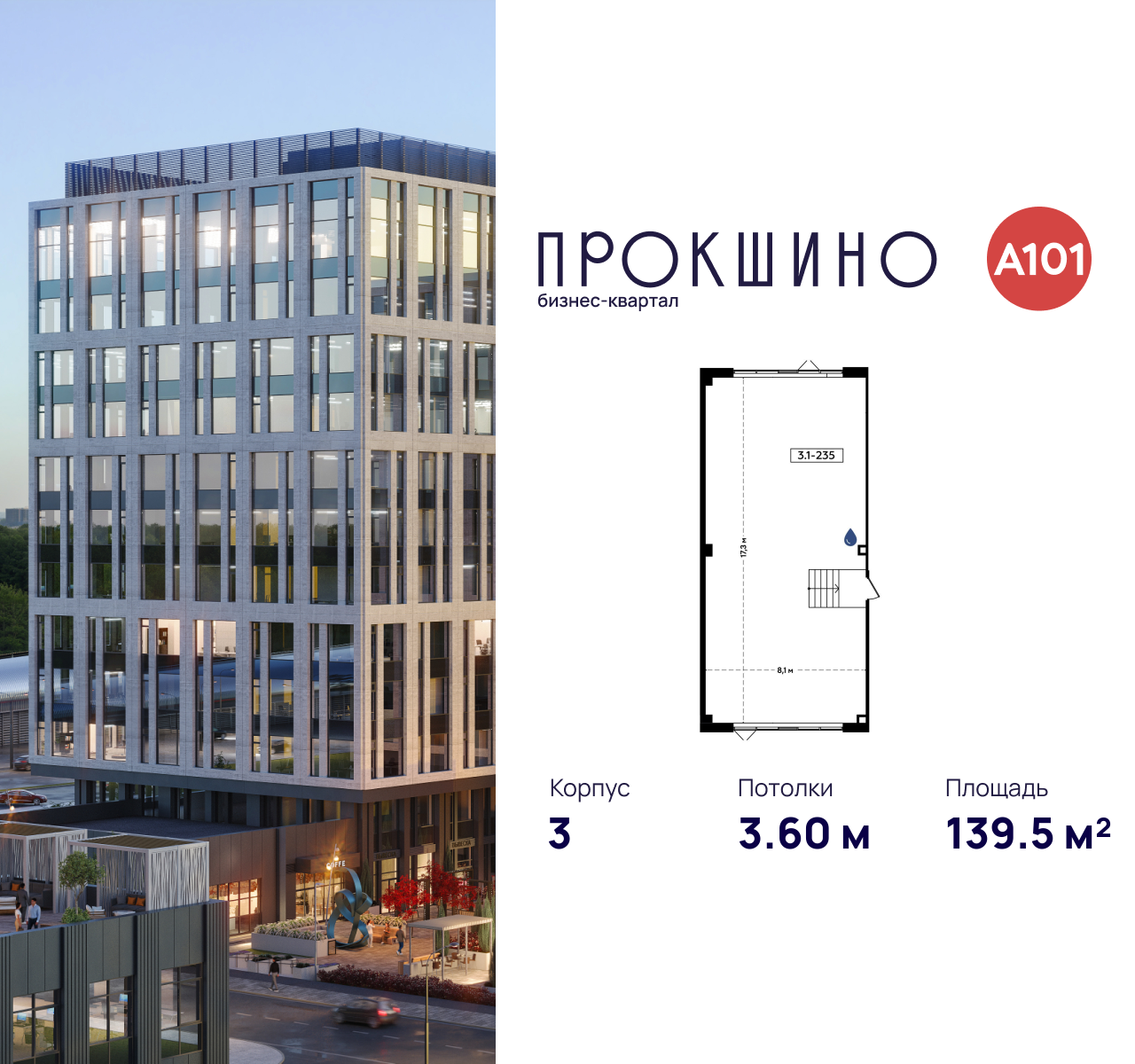 Продаётся офисное помещение площадью 139.5 кв. м. в Бизнес-квартал «Прокшино». Без отделки. Окна с видом во двор и на улицу. Высота потолков 3.6 м. Выделенная электрическая мощность — 12 кВт. Общий вход с улицы. Стоимость помещения — 28 555 650 руб. Способы оплаты и более подробная информация по телефону.