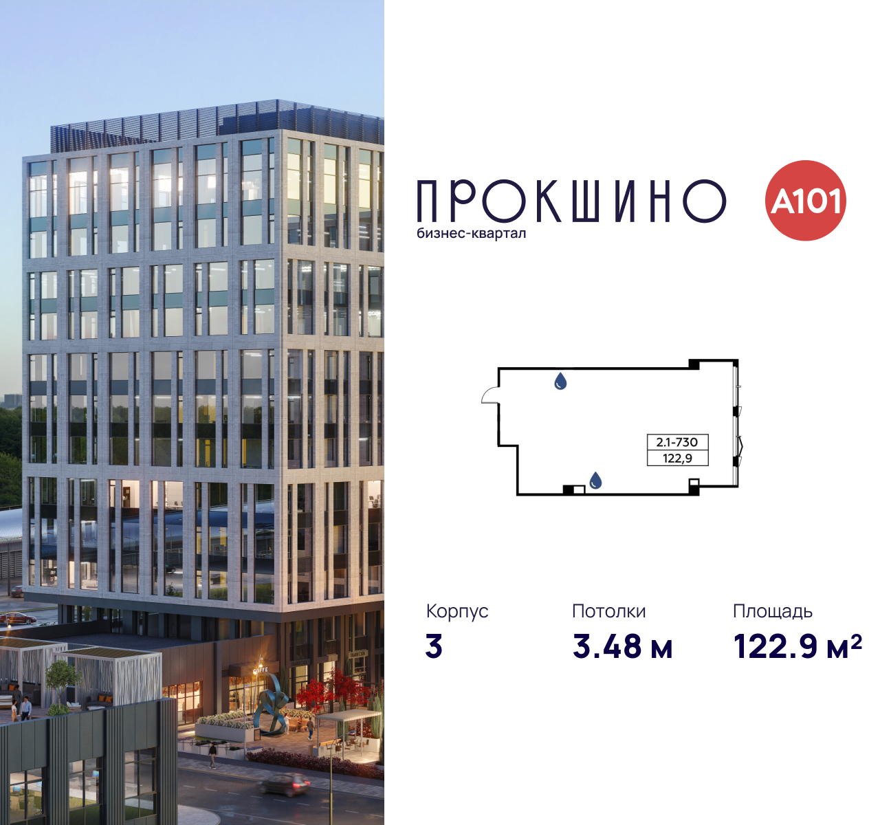 Продаётся офисное помещение площадью 122.9 кв. м. в Бизнес-квартал «Прокшино». Без отделки. Окна с видом на улицу. Высота потолков 3.6 м. Выделенная электрическая мощность — 10 кВт. Отдельный вход с улицы. Стоимость помещения — 26 008 098 руб. Способы оплаты и более подробная информация по телефону.