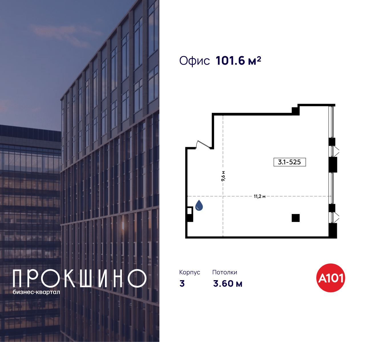 Продаётся офисное помещение площадью 101.6 кв. м. в Бизнес-квартал «Прокшино». Без отделки. Окна с видом на улицу. Высота потолков 3.6 м. Выделенная электрическая мощность — 9 кВт. Общий вход с улицы. Стоимость помещения — 26 543 000 руб. Способы оплаты и более подробная информация по телефону.
