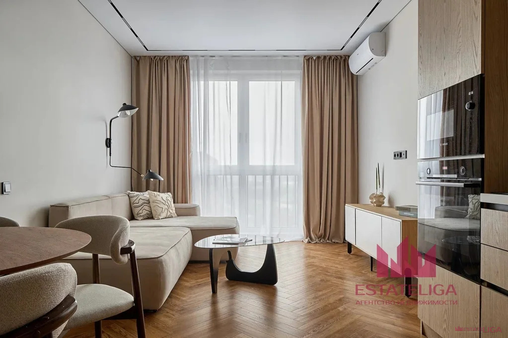 В квартире большая кухня-гостиная 30 м2, укомплектованная встроенной кухней и техникой.