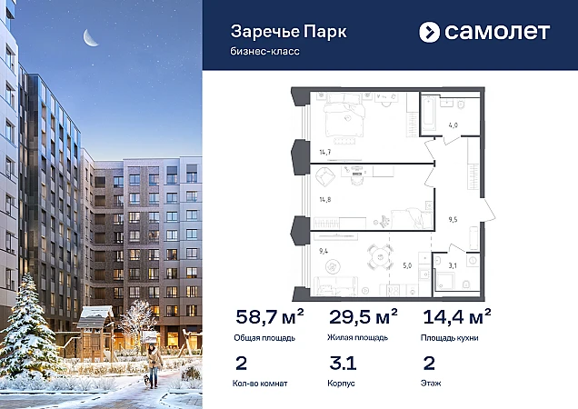 Строим кварталы для жизни с заботой о будущем. Предлагается 2-комнатная квартира бизнес-класса 58,7 кв.м в корпусе 3.1 на 2 этаже, в ЖК «Заречье Парк»