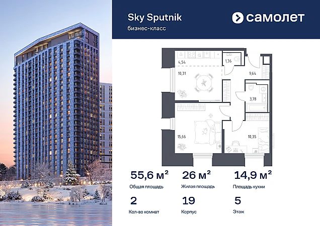 Строим кварталы для жизни с заботой о будущем. Предлагаются 2-комнатные апартаменты бизнес-класса 55,64 кв.м в корпусе 19 на 5 этаже, в Sky Sputnik
