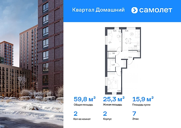 Строим кварталы для жизни с заботой о будущем. Предлагается 2-комнатная квартира комфорт-класса 59,76 кв.м в корпусе 2 на 7 этаже, в ЖК «Квартал Домашний»