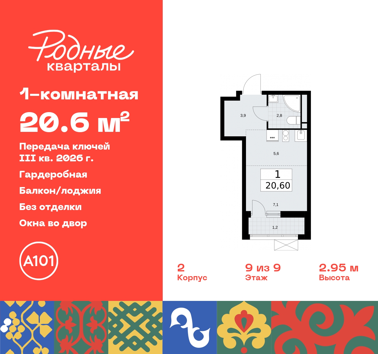 1-комн. квартира-студия в ЖК "Родные кварталы" на 9 этаже. Квартира без отделки, после оформления собственности можно делать ремонт. Общая площадь: 20.6 кв.м., площадь гостиной 12.7 кв.м., из которых 5.6 кв.м. выделено под кухонную зону. Все окна выходят на одну сторону. В квартире один балкон, один совмещенный санузел. Высота потолков 2.9 м.