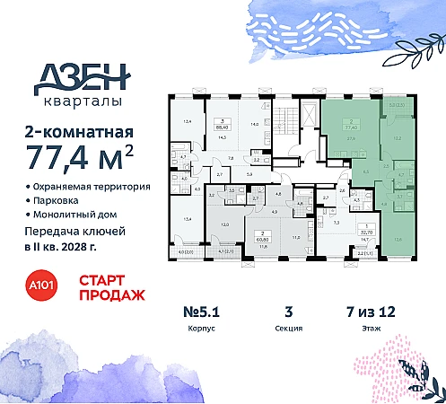 Купить 2к квартиру 77 м² в ЖК "Дзен-кварталы"