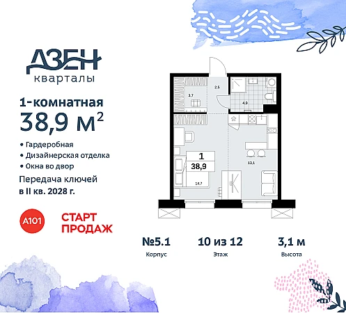 Купить 1к квартиру 38 м² в ЖК "Дзен-кварталы"