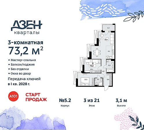 Купить 3к квартиру 73 м² в ЖК "Дзен-кварталы"