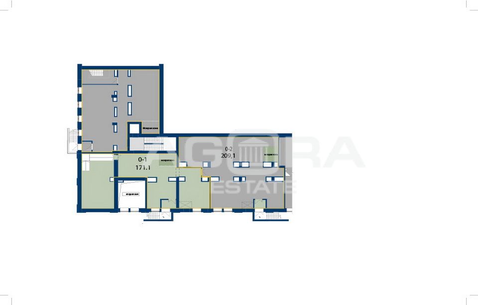 Площадь - 171,1 кв.м. цокольный этаж. Отдельный вход с улицы. Высокий потолки - 3,3 м. Открытая планировка, все городские коммуникации.