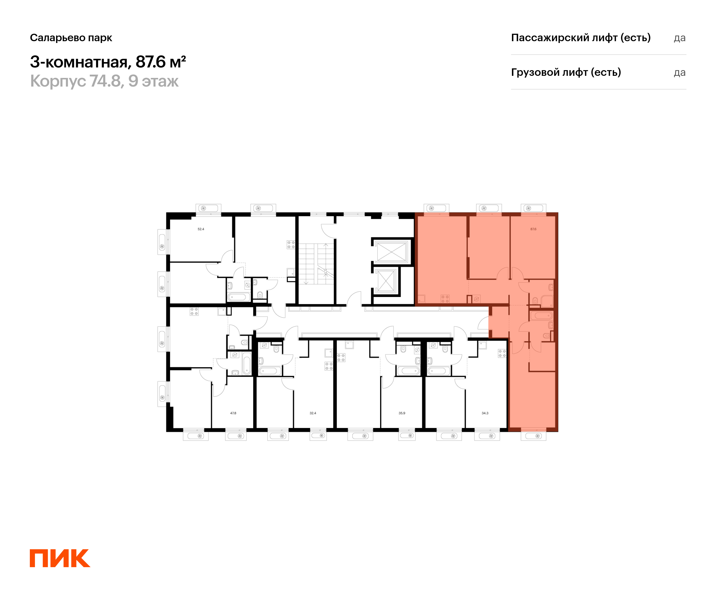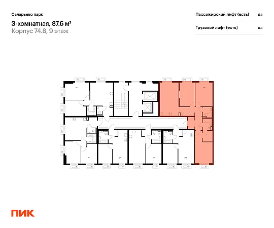 Продаётся 3-комн.квартира площадью 87.60 кв.м на 9 этаже 15 этажного дома (Корпус 74.8, секция 8) проекта ПИК Саларьево парк. Светлый просторный подъезд на уровне земли, функциональная планировка, большие окна, с отделкой.