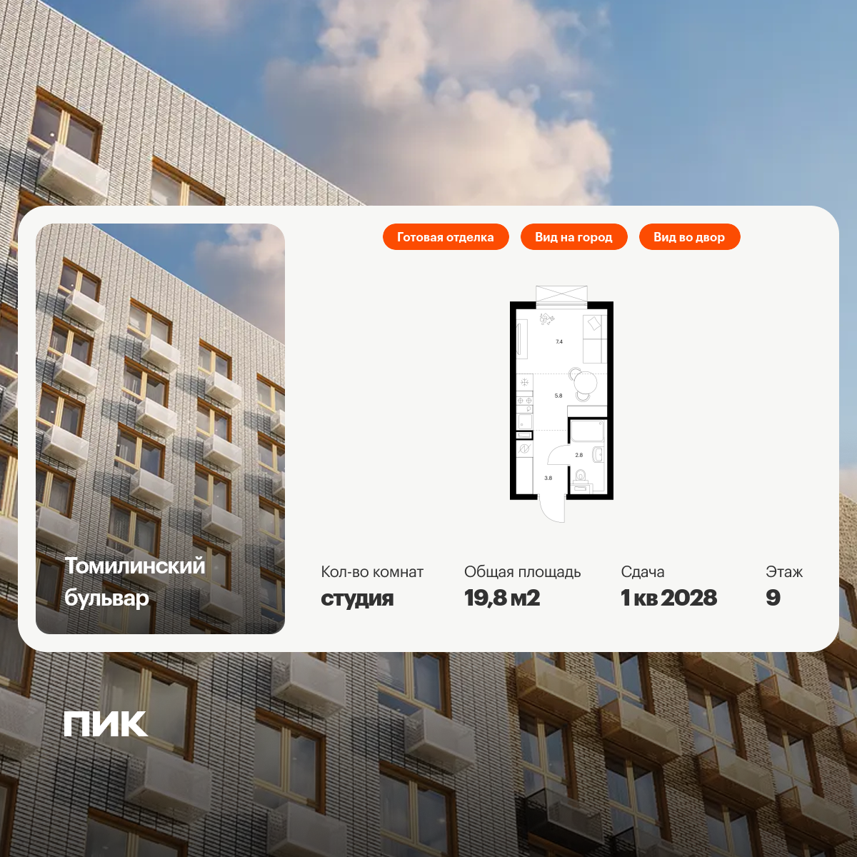 Продаётся квартира-студия площадью 19.80 кв.м на 9 этаже 25 этажного дома (Корпус 5-8, секция 1) проекта ПИК Томилинский бульвар. Светлый просторный подъезд на уровне земли, функциональная планировка, большие окна, с отделкой.