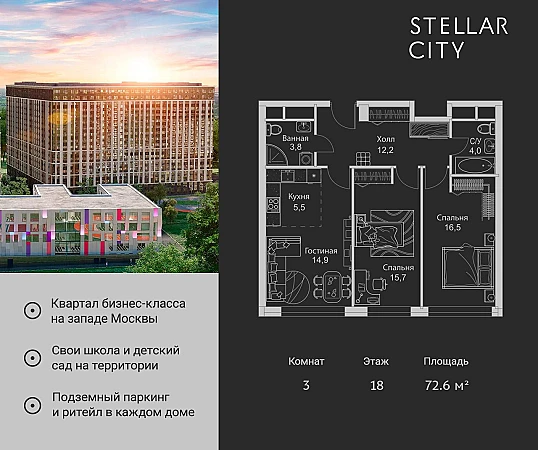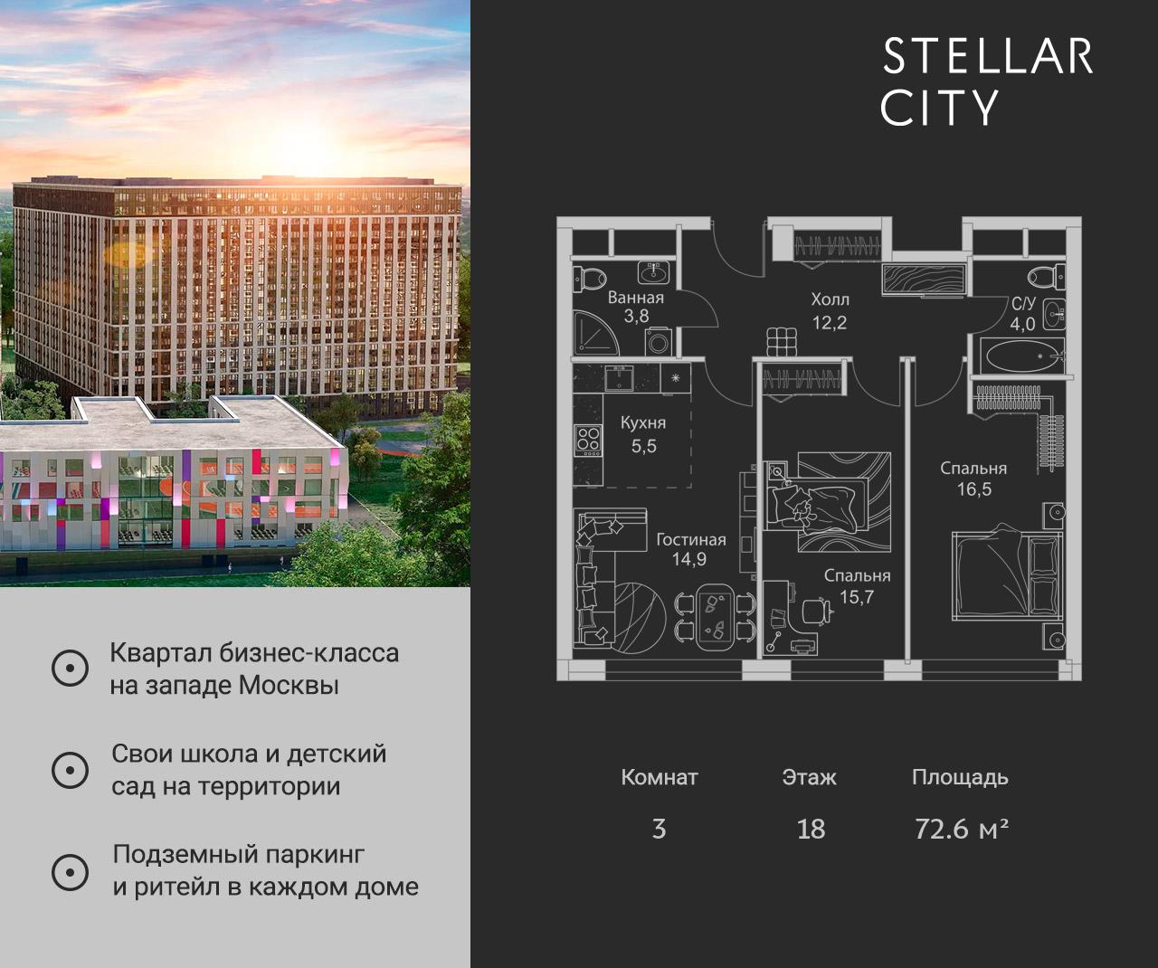 Купить 3к квартиру 72 м² в ЖК Stellar City (Стеллар Сити)