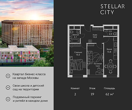 Купить 2к квартиру 62 м² в ЖК Stellar City (Стеллар Сити)