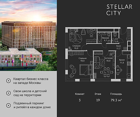 Купить 3к квартиру 79 м² в ЖК Stellar City (Стеллар Сити)