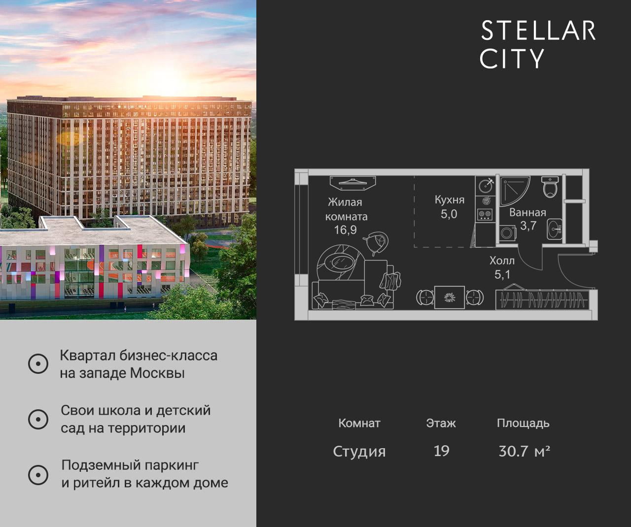 Продается квартира от надежного застройщика Tashir Estate в квартале бизнес-класса Stellar City в ЗАО Москвы. Площадь квартиры составляет: 30.7 кв. м, потолки: 3.1 м Квартира находится на 19 этаже, 4 корпуса жилого квартала Stellar City — микрогорода будущего на орбите Москвы. Stellar City — квартал в ЗАО Москвы вблизи инновационного центра Сколково. В окружении — 11 парков и природных зон, в том числе Долина реки Сетунь, Мещерский лес и парк развлечений The Rink. Город в городеЧтобы дом и инфраструктура вокруг отвечала динамичному лайфстайлу жителя мегаполиса, в основу проекта легла концепция “город в городе”, которая позволяет решать все бытовые вопросы in-home. В квартале будут возведены школа и детский сад, воркаут-зоны, променад, вело‒ и беговые дорожки, детские площадки для каждого корпуса, а также коммерция на первых этажах для ежедневных покупок. Все необходимое — на расстоянии нескольких шагов. Изящные и лаконичные лоббиАвторский дизайн, натуральные материалы в отделке и безупречный интерьер вне времени. Лобби и холлы в проекте бизнес-класса Stellar City ничем не отличаются от входных групп в премиум-сегменте благодаря качественным европейским материалам в отделке, стильному дизайну, консьерж-сервису и уютной зоне ожидания с журнальными столиками и мягкой мебелью. Комфорт и безопасностьЗакрытая территория, охрана, система СКУД, специально разработанное мобильное приложение дома для резидентов и подземный паркинг с круглосуточным наблюдением и доступом с помощью автоматического считывания номера авто.