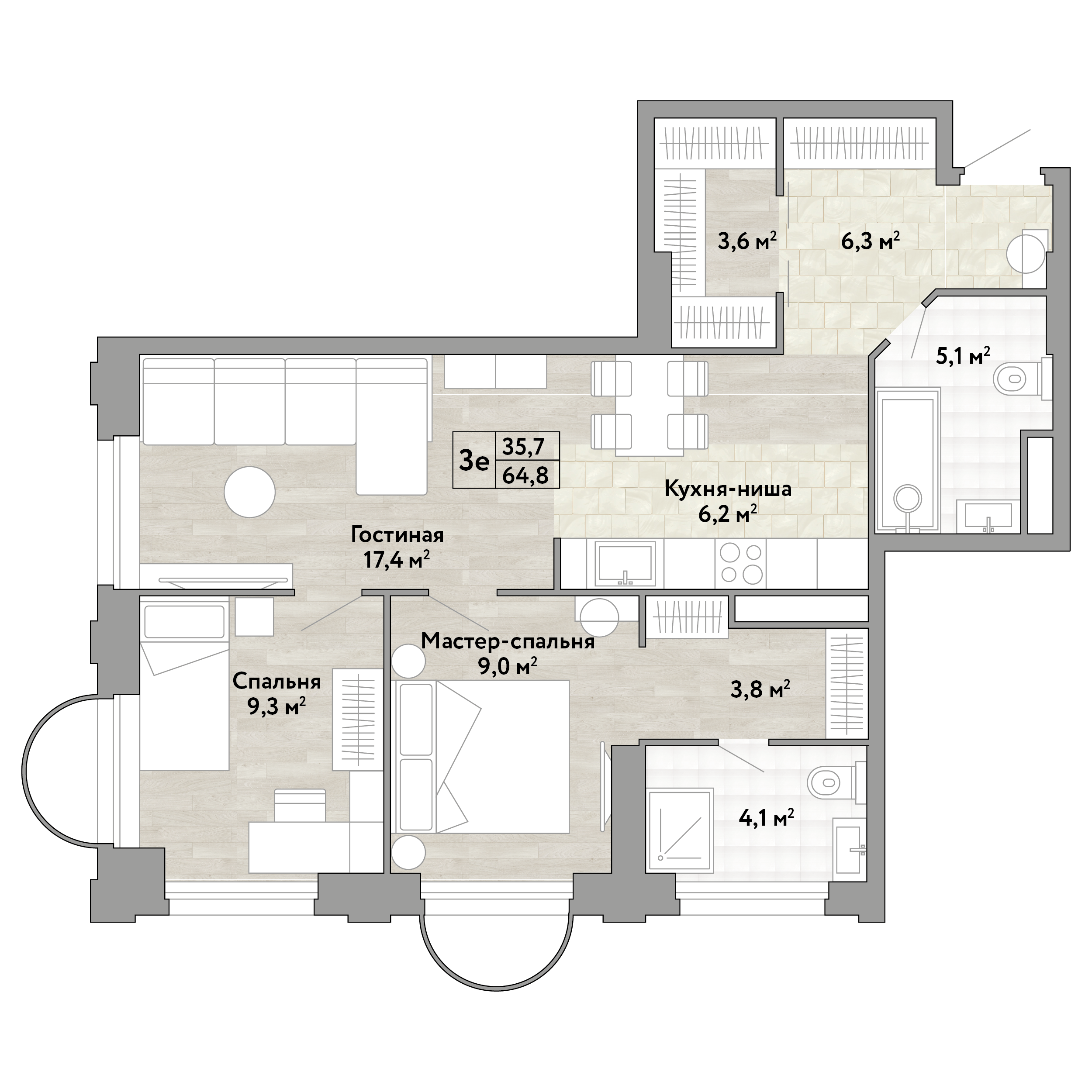 Площадь квартиры составляет: 61.3 кв. м, потолки: 3.1 м