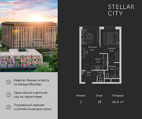 Купить 2к квартиру 46 м² в ЖК Stellar City (Стеллар Сити)