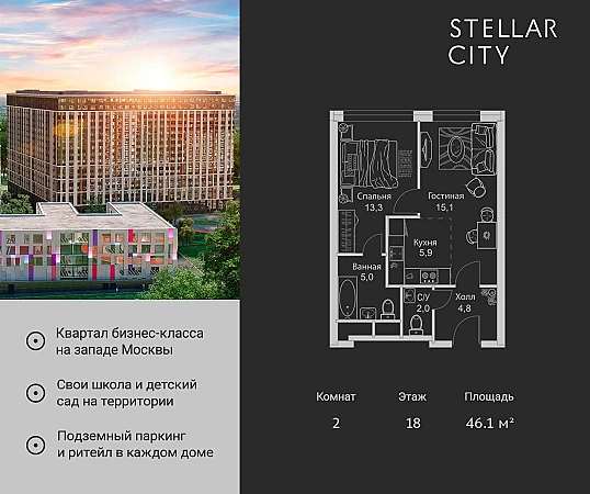 Продается квартира от надежного застройщика Tashir Estate в квартале бизнес-класса Stellar City в ЗАО Москвы.