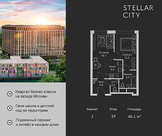 Продается квартира от надежного застройщика Tashir Estate в квартале бизнес-класса Stellar City в ЗАО Москвы. Площадь квартиры составляет: 46.1 кв. м, потолки: 3.1 м Квартира находится на 19 этаже, 4 корпуса жилого квартала Stellar City — микрогорода будущего на орбите Москвы. Stellar City — квартал в ЗАО Москвы вблизи инновационного центра Сколково. В окружении — 11 парков и природных зон, в том числе Долина реки Сетунь, Мещерский лес и парк развлечений The Rink. Город в городеЧтобы дом и инфраструктура вокруг отвечала динамичному лайфстайлу жителя мегаполиса, в основу проекта легла концепция “город в городе”, которая позволяет решать все бытовые вопросы in-home. В квартале будут возведены школа и детский сад, воркаут-зоны, променад, вело‒ и беговые дорожки, детские площадки для каждого корпуса, а также коммерция на первых этажах для ежедневных покупок. Все необходимое — на расстоянии нескольких шагов. Изящные и лаконичные лоббиАвторский дизайн, натуральные материалы в отделке и безупречный интерьер вне времени. Лобби и холлы в проекте бизнес-класса Stellar City ничем не отличаются от входных групп в премиум-сегменте благодаря качественным европейским материалам в отделке, стильному дизайну, консьерж-сервису и уютной зоне ожидания с журнальными столиками и мягкой мебелью. Комфорт и безопасностьЗакрытая территория, охрана, система СКУД, специально разработанное мобильное приложение дома для резидентов и подземный паркинг с круглосуточным наблюдением и доступом с помощью автоматического считывания номера авто.