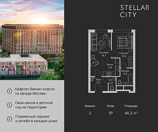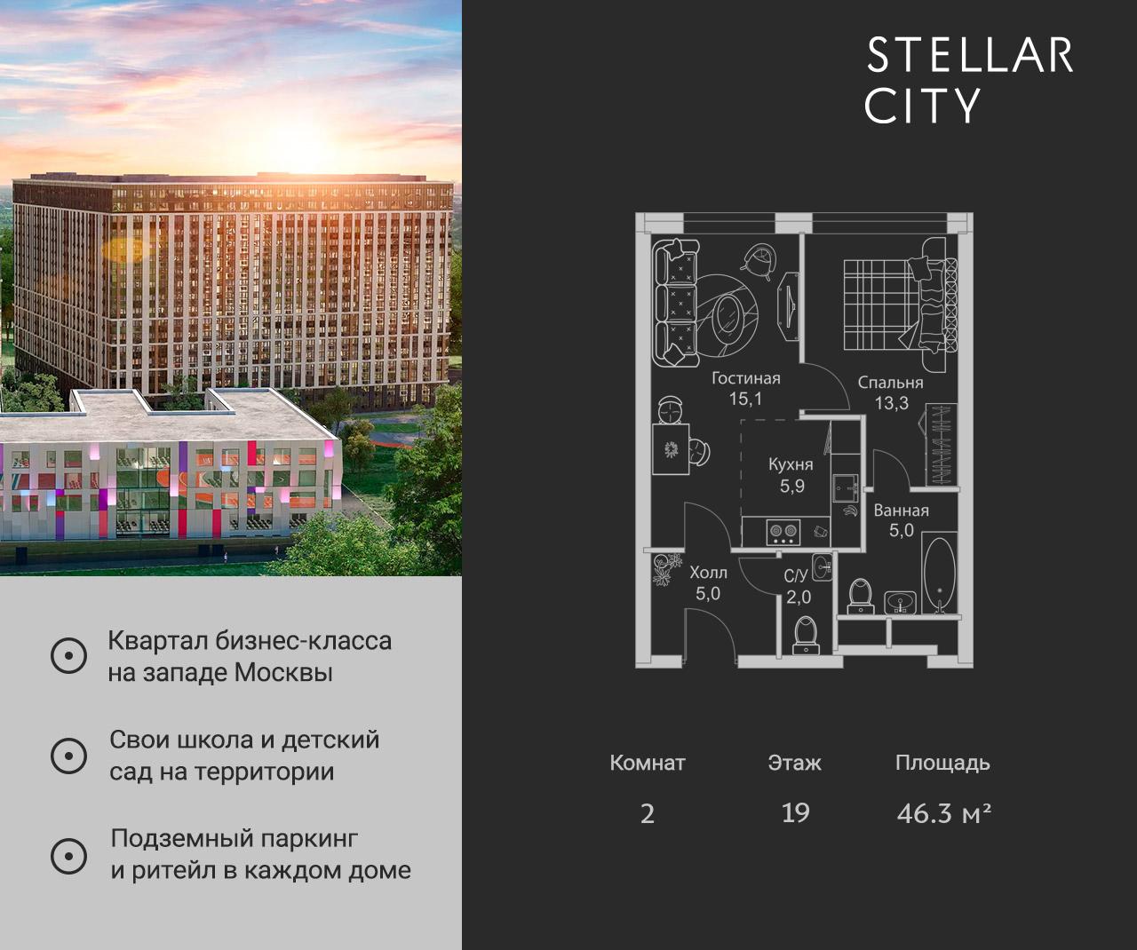 Продается квартира от надежного застройщика Tashir Estate в квартале бизнес-класса Stellar City в ЗАО Москвы. Площадь квартиры составляет: 46.3 кв. м, потолки: 3.1 м Квартира находится на 19 этаже, 4 корпуса жилого квартала Stellar City — микрогорода будущего на орбите Москвы. Stellar City — квартал в ЗАО Москвы вблизи инновационного центра Сколково. В окружении — 11 парков и природных зон, в том числе Долина реки Сетунь, Мещерский лес и парк развлечений The Rink. Город в городеЧтобы дом и инфраструктура вокруг отвечала динамичному лайфстайлу жителя мегаполиса, в основу проекта легла концепция “город в городе”, которая позволяет решать все бытовые вопросы in-home. В квартале будут возведены школа и детский сад, воркаут-зоны, променад, вело‒ и беговые дорожки, детские площадки для каждого корпуса, а также коммерция на первых этажах для ежедневных покупок. Все необходимое — на расстоянии нескольких шагов. Изящные и лаконичные лоббиАвторский дизайн, натуральные материалы в отделке и безупречный интерьер вне времени. Лобби и холлы в проекте бизнес-класса Stellar City ничем не отличаются от входных групп в премиум-сегменте благодаря качественным европейским материалам в отделке, стильному дизайну, консьерж-сервису и уютной зоне ожидания с журнальными столиками и мягкой мебелью. Комфорт и безопасностьЗакрытая территория, охрана, система СКУД, специально разработанное мобильное приложение дома для резидентов и подземный паркинг с круглосуточным наблюдением и доступом с помощью автоматического считывания номера авто.