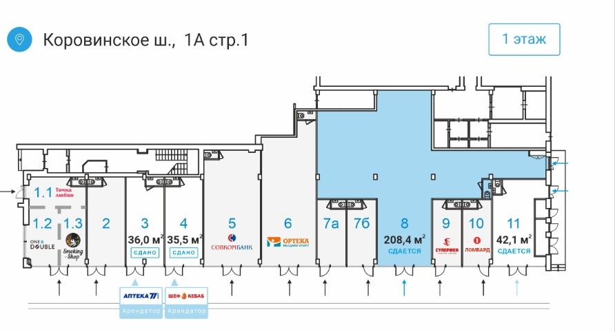 Торговый центр находится на первой линии домов Коровинского шоссе, хорошо просматривается с проезжей части. Интенсивный автомобильный и пешеходный трафик. Описание помещения: Возможность размещения вывески. Отдельный вход. Этаж: 1. Планировка: открытая ( open space ). Типовой ремонт. Высокие потолки. Высота потолка: 4м. Тип налогообложения: УСН. Договор купли - продажи недвижимости. Налоговая: 43. Лифты: Нет. Вентиляция: Приточно-вытяжная. Кондиционирование: Сплит-системы. Безопасность: Система пожаротушений, Видеонаблюдение. Провайдеры: . Парковка: Наземная. Лот 46395-125
