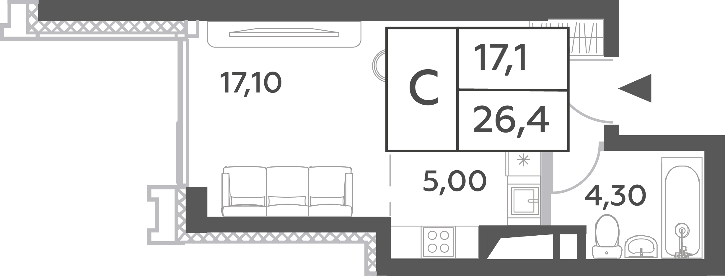 Планировка компактной студии площадью 25,6 м2 отличается рациональностью и эффективным использованием пространства: при входе в квартиру разместилась гардеробная зона и полноценная ванная комната, конфигурация жилой части дает возможность гамоничного зонирования кухонного и спального пространств. В сочетании с высотой потолков от 3 метров открываются широкие возможности для экспериментов с интерьером.