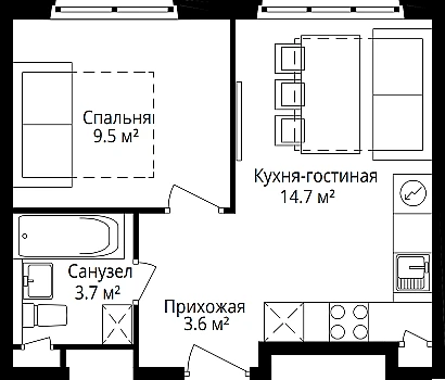 Жилая площадь 14.23 м2, кухня 3.17 кв. м, типовой ремонт, комнаты смежные, окна выходят во двор.