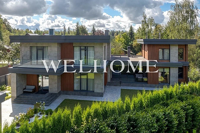 ID объекта: Z-16032. Современный дом с баней и барбекю у лесаРедкий объект на рынке! Новый модный стильный дом площадью 480 кв.м на участке 19 соток всего в 14 км от МКАД по Новорижскому шоссе в глубине стародачного поселка Ольгино. На участке расположен основной дом, который архитектурно объединен второй гостиной с большой баней из клееного бруса (429 кв.м), гараж на 2 м/м с раздвижной стенкой из стекла (35 кв.м), отапливаемый хоз.блок с двумя помещениями (15 кв.м) и аутентичный колодец с питьевой водой.Функциональная планировка: 7 спален (5 в основном доме + 2 гостевые в банном комплексе), светлая гостиная, столовая, кухня с островом и кладовой для продуктов, барбекю-зона с террасой, парная с дровяной печью, постирочная, котельная.Особенности: конструктив - полнотелый кирпич, панорамные окна, авторская отделка, паровой камин, премиальная сантехника и бытовая техника, теплые полы, видеонаблюдение. Фишка - собственная калитка в лес. ПЛАНИРОВКАОсновной дом1 этаж: Прихожая (7,2), гардеробная (7,8), гостевой с/у ( 3,7), лестничный холл (23), гостиная-столовая (43,2), кухня (22,7) с кладовой (4,3), зона барбекю (32), терраса (20,3). Гостевая спальня (15,1) с ванной (4,3).2 этаж: Мастер-спальня (21,1) с гардеробной (7,3), ванной комнатой (9,4) и балконом (6,17). Детские (24 + 18,7 + 16,4), общая ванная комната (7,8), холл (17,3).Баня 1 этаж: Комната отдыха (17,4), парная (7,8), душевая (6,6), с/у (2), лестничный холл (6,5). 2 этаж: Гостевые спальни (17,5 + 11,4), холл (7,8).Цоколь: Котельная (11,3), кладовая (5,31), помещение свободного назначения (24,1).КОММУНИКАЦИИЭлектричество 15 кВтВодоснабжение - локальное. Скважина 118 мТакже на участке есть колодец, глубина 10 мМагистральный газ. Котел BuderusЛокальная канализацияУЧАСТОКУчасток состоит из двух частей (обе - в собственности): - 9 соток - прилегающая к дому благоустроенная территория с газоном и естественным ограждением из туй. Проложены дорожки, высажены цветы и декоративные кустарники, выполнено вечернее освещение. - 10 соток - свободная от строений территория с естественной растительностью и взрослыми деревьями.Непосредственно за забором - гостевая парковка на 3-4 м/м и собственная калитка в лес.