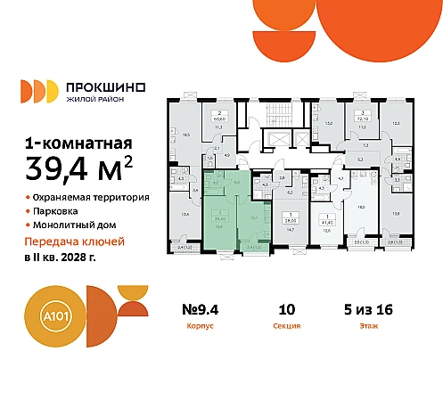 Дом монолитный, черырехподъездный, переменной этажности, от 10 до 16 этажей. Квартира находится в 3-й секции высотой 13 этажей в корпусе 9.4. На этаже 5 квартир. В подъезде 1 пассажирский и 1 грузовой лифт. Начало строительства - 3 квартал 2025 года. Окончание строительства - 4 квартал 2027 года. Оформление сделки по договору долевого участия.