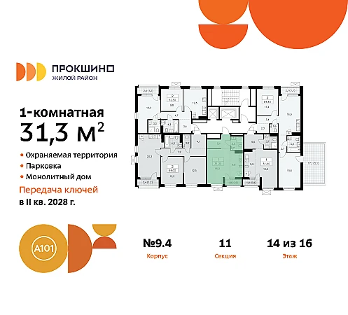 Дом монолитный, черырехподъездный, переменной этажности, от 10 до 16 этажей. Квартира находится в 4-й секции высотой 15 этажей в корпусе 9.4. На этаже 5 квартир. В подъезде 1 пассажирский и 1 грузовой лифт. Начало строительства - 3 квартал 2025 года. Окончание строительства - 4 квартал 2027 года. Оформление сделки по договору долевого участия.