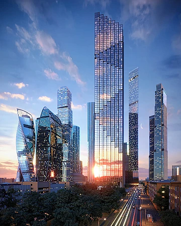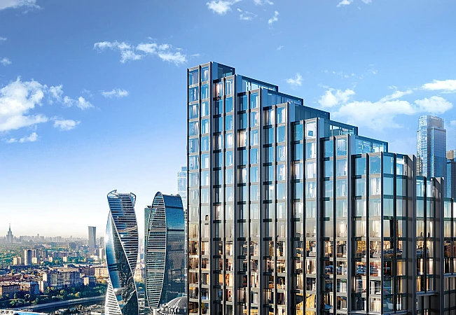 Многофункциональный жилой комплекс Дом Дау премиум-класса расположен в Пресненском районе Москвы (ЦАО), в главном деловом кластере Москвы, рядом с парком «Красная Пресня». Самый высокий жилой небоскреб качественно дополнят коллекцию небоскребов деловом кластере новыми форматами: в здании квартиры, а не апартаменты, а еще удобная инфраструктура для семей с детьми. В «Москва-Сити» станет еще удобнее жить и работать.Основными материалами фасадов здания стали традиционные для высотных объектов стекло и металл, но с помощью этой привычной «палитры» архитекторы создают максимально динамичный и неожиданный в структуре ММЦД образ. С помощью многочисленных вертикальных тяг (импостов, выполненных из металла) подчеркнута устремленность объема ввысь, а декоративные треугольные консоли, расположенные со смещением по диагонали, формируют своего рода спираль, словно оплетающую высотку, и тем самым придают каждому фасаду индивидуальность, служа залогом того, что башня с разных ракурсов будет восприниматься совершенно по-разному.