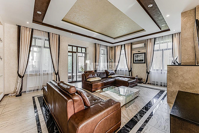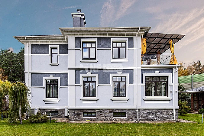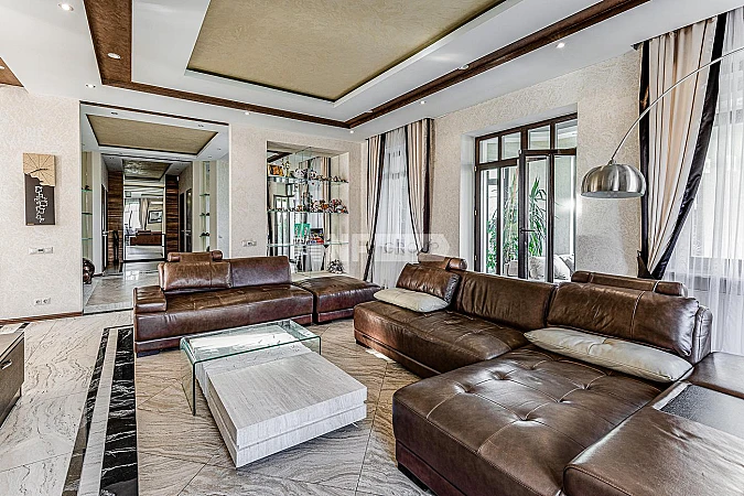 Четырёхуровневый дом в закрытом охраняемом посёлке с хорошей инфраструктурой. Расположен на тупиковой улице, примыкающей к лесу. Полностью меблирован и готов к проживанию. Высокие потолки. Из гостиной выход в зимний сад. Бар и тренажерный зал. Современный ремонт с использованием натуральных материалов: мрамор, дерево. Есть помещение для персонала. Охранная сигнализация, система видеонаблюдения. В котельной оборудование Buderus с обвязкой медью.