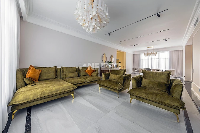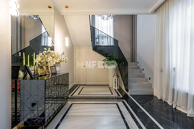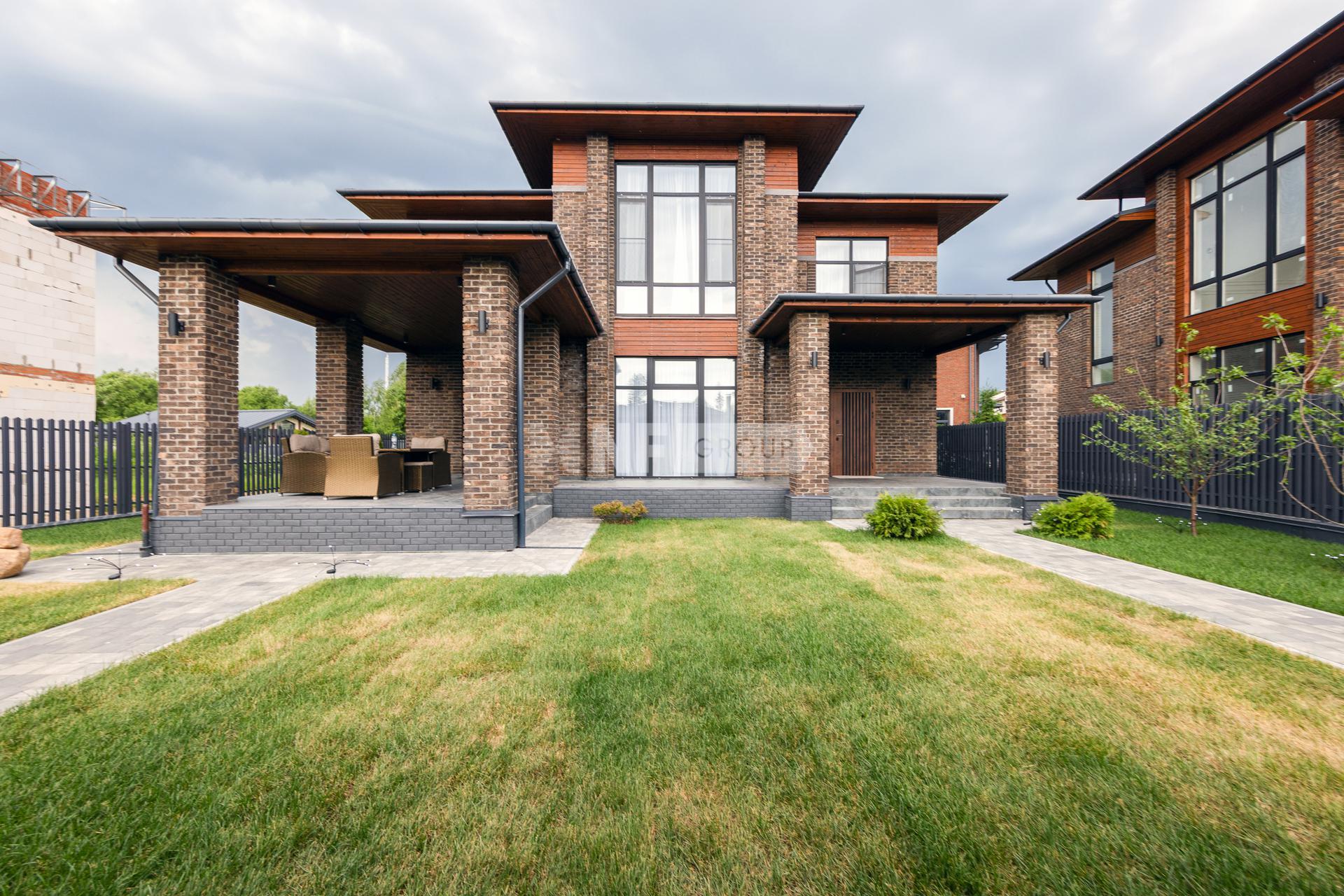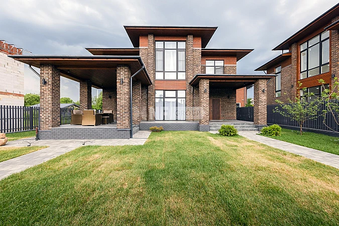 Дом построен из кирпича, фасад облицован клинкерным кирпичом, крыша — мягкая черепица. Интерьер выполнен с использованием премиальных материалов: паркетная доска, тёплый пол, панорамные окна. Установлены система приточной вентиляции и кондиционирования. Кухня Mr.Doors, встроенная премиальная техника, варочная панель с интегрированной вытяжкой, два холодильника.
