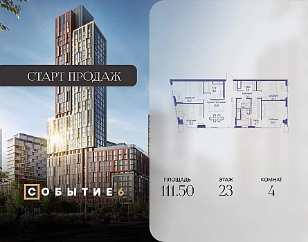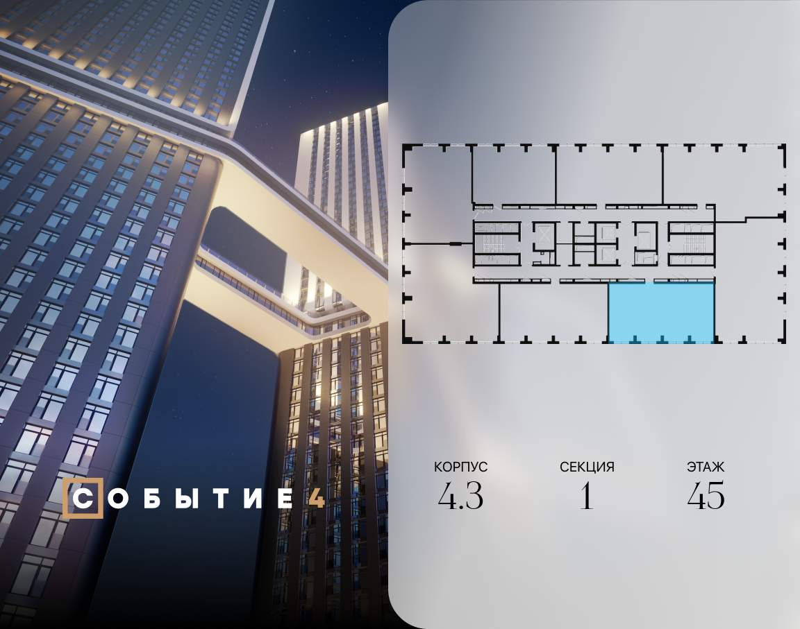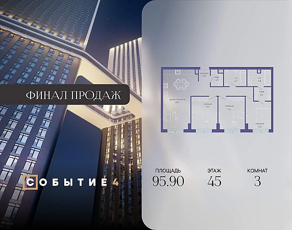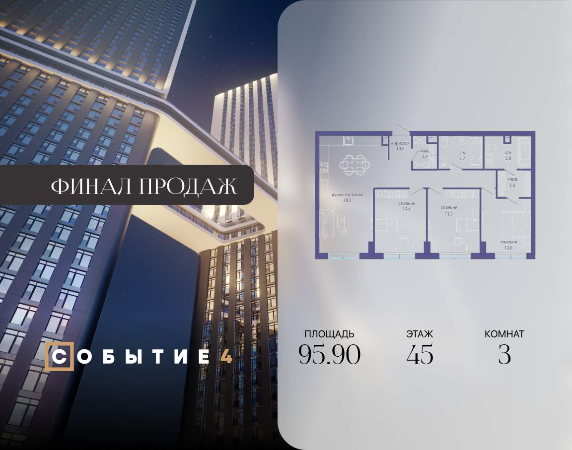 Продаётся 3-комнатная квартира от застройщика: общая площадь 95.90 м, жилая 39.00 м, кухня 28.30 м, 45-й этаж, жилой квартал «Событие-4», корпус 3 (секция 1) Срок сдачи: 2 квартал 2027 года.