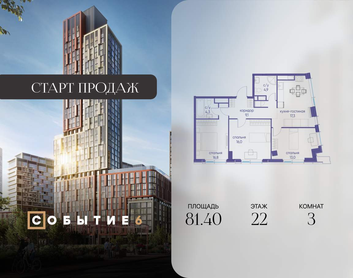 Продаётся 3-комнатная квартира от застройщика: общая площадь 81.40 м, жилая м, кухня м, 22-й этаж, жилой квартал «Событие-6», корпус 2 (секция 5) Срок сдачи: 1 квартал 2029 года.