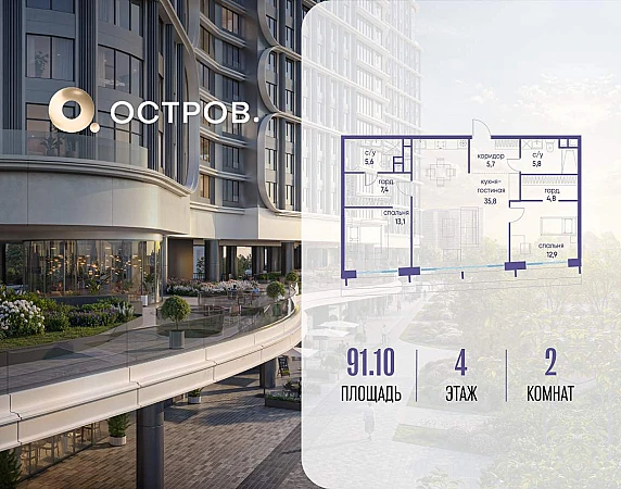 Продаётся 2-комн. квартира от застройщика: общая площадь 91.10 м, жилая 26.00 м, кухня 35.80 м, 4-й этаж, жилой квартал «Остров 7», корпус 3 (секция 1) . Срок сдачи: 1 квартал 2028 года.